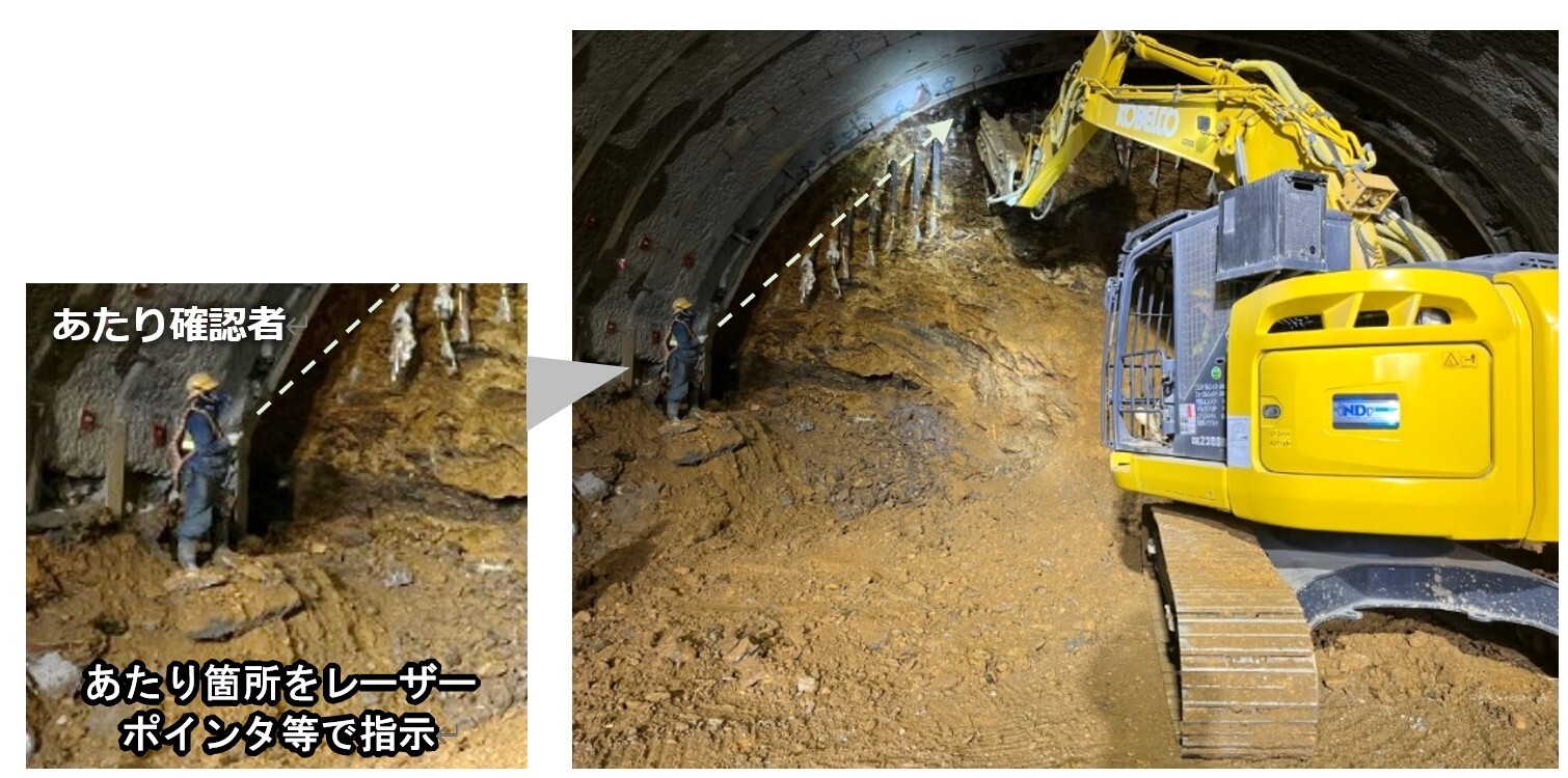 建設業界では自動施工技術による省人化や安全性向上が求められており、国土交通省においても、山岳トンネル工事における施工のオートメーション化に向けた取り組みが開始されています。山岳トンネル工事では、発破後に生じる切羽岩盤の凸凹に対し、設計断面から飛び出た箇所(あたり)をブレーカーショベルで除去する、あたり取り作業が行われます。従来、この作業は、重機のオペレータと作業員の2名で行いますが、掘削直後に切羽付近で目視確認を行う必要があるため、肌落ち災害のリスクが問題となっています(図1)。こうした問題を解決するため、安藤ハザマでは2024年に、トンネル切羽のあたり箇所をリアルタイムに把握できる「あたり検知システム」を開発しました(注3)。本システムにより、切羽から離れた位置で確認作業を実施できるようになり、安全性の向上に寄与しています。このあたり取り作業の施工技術のさらなる高度化に向けて、コベルコ建機が開発中の「自動運転システム」と連携した自動化技術の開発を進めています。